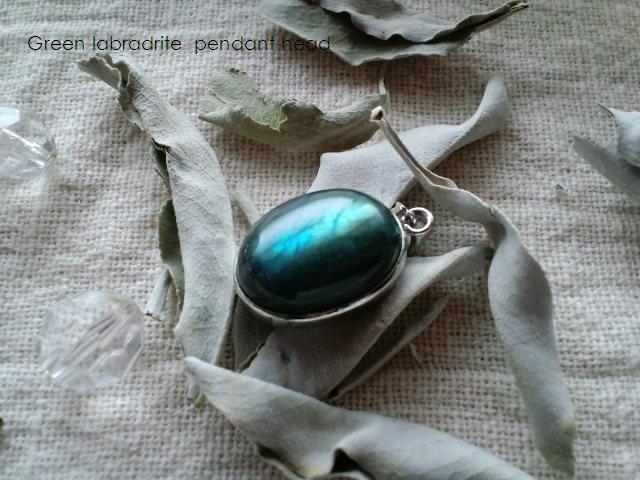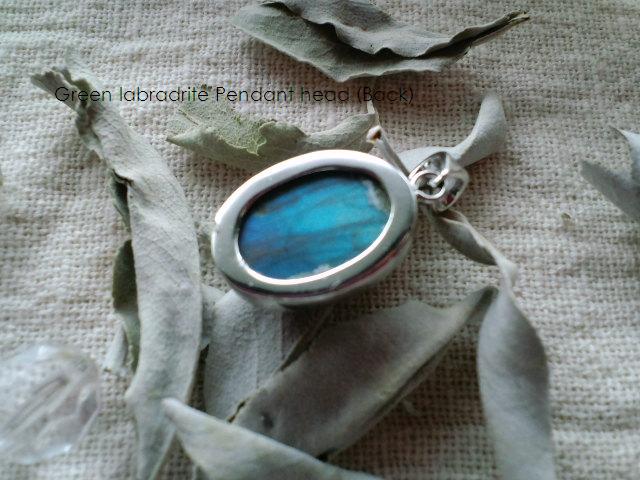 良く見かける形のペンダントトップ。これは表面が緑色が濃いタイプで裏側は青っぽい。今気付きましたが虫っぽい撮り方になってしまってますね(笑)いくつかラブラドライトを持っていますが、私の所に来たラブラドライトは、どの主人公も共通して「血と涙」「悲しみ」の物語を持っているようです。綺麗な輝きの理由をお話ししてくれました。